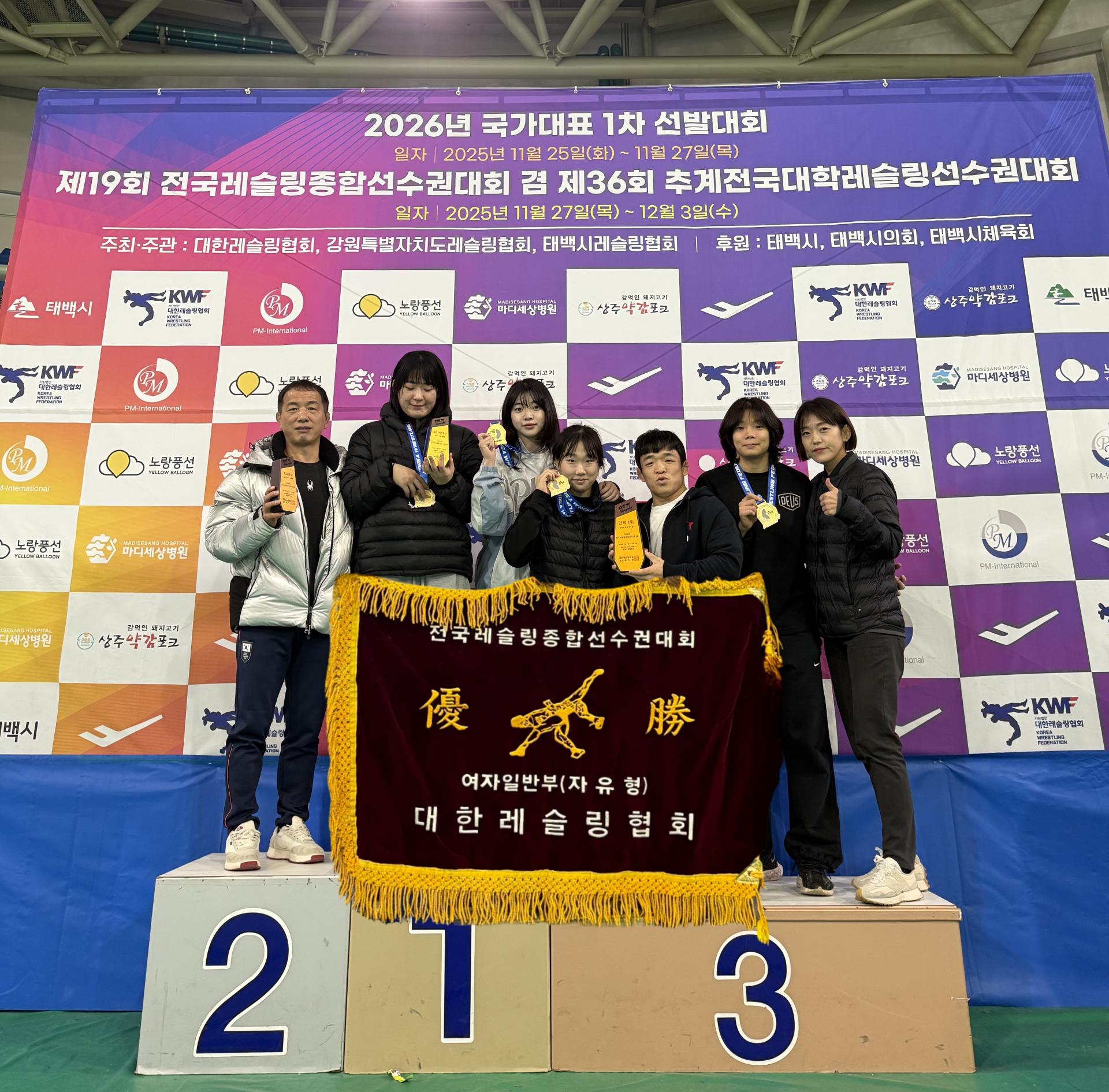 지난 3일 강원도 태백 고원체육관에서 폐막한 ‘제19회 전국레슬링종합선수권대회’ 여자 자유형 경기에서 유성구청 선수들은 4개 체급을 모두 석권했다. 권미선(53kg급), 민예지(55kg급), 조수빈(65kg급), 오채은(76kg급) 등 네 선수 모두 금메달을 차지하며 팀 저력을 과시했다.